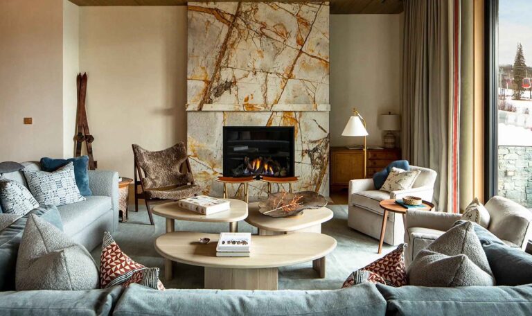 Just 25 residences range from one to seven bedrooms and are available for short escapes or extended alpine stays. Interiors balance rugged elegance with modern comfort, featuring marble fireplaces, wood-beamed ceilings, heated floors, and kitchens outfitted with Wolf and Sub-Zero appliances. Personalized service means no lobby lines, valets ready your skis, and every detail is curated for effortless living.