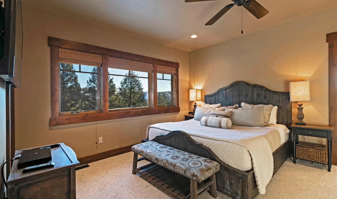 An open-concept great room anchors the home, centered around a stone fireplace that adds warmth and a sense of place. En-suite bedrooms provide quiet separation, while quality materials and finishes elevate the interior beyond a typical mountain residence.