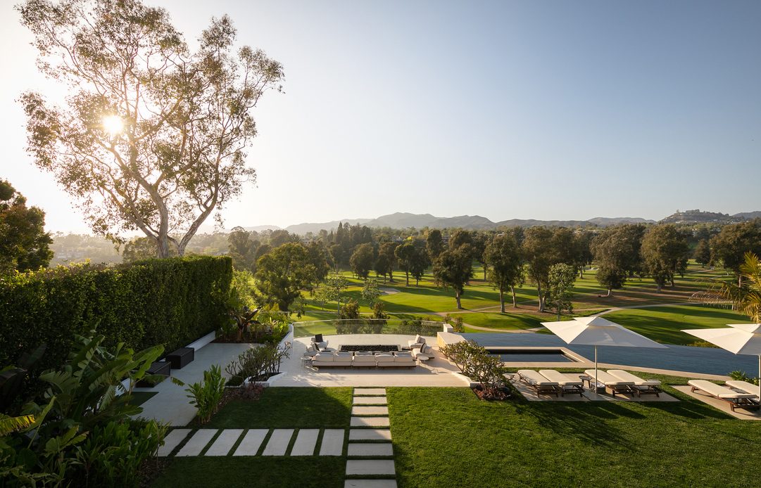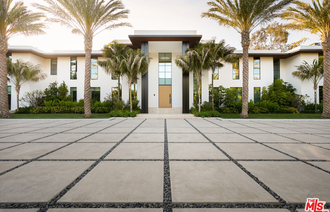 Extensively remodeled in 2019, this extraordinary contemporary Santa Monica estate offers a custom living experience created and designed by world renowned ultra high end company Molori with 200-feet of prestigious Riviera Country Club frontage, magnificent fairway and mountain views, and exceptional amenities including a pool, spa, theater, karaoke room, and indoor basketball court. Mature palm trees line the entrance, surrounded by lush greenery.